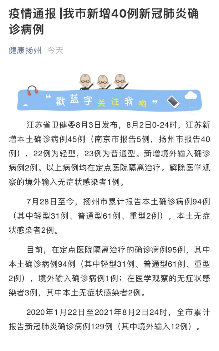 据“健康扬州”微信号,江苏省卫健委8月3日发布,8月2日0-24时,江苏新增本土确诊病例45例(南京市报告5例,扬州市报告40例),22例为轻型,23例为普通型。新增境外输入确诊病例2例。以上病例均在定点医院隔离治疗。解除医学观察的境外输入无症状感染者1例。