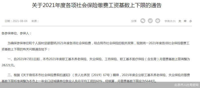 北京商报讯(记者 陶凤 吕银玲)8月4日,北京市社会保险基金管理中心、北京市医疗保险事务管理中心联合发布《关于2021年度各项社会保险缴费工资基数上下限的通告》(以下简称《通告》),明确了2021年度各项社会保险缴费工资基数上下限调整的相关事项。