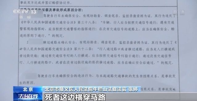 北京市顺义区人民法院牛栏山法庭法官 张婷:事故认定的是死者横穿马路,没有确保交通安全,然后原告这边也是没有确保行人安全,所以给他们认定的是同等责任。