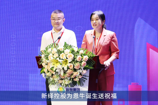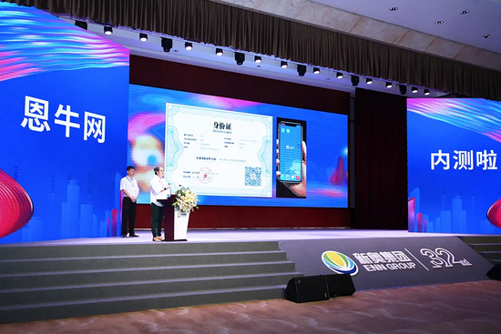 新奥新智首席数字技术理正师汪一鸣作为恩牛网的“父母”代表,从“助产士”、新奥新智首席数字安全理正师王静媛手中接过恩牛出生纪念册和小牛布偶。他们还现场展示了恩牛网的数字身份证。