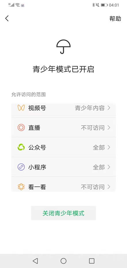 2021年6月,微信曾宣布对“青少年模式”保护能力升级,进入视频号将“能看到精选的适合青少年的内容”;此外,“开启青少年模式后,Q币充值、微粒贷、理财通、信用卡功能也将不可用,爸妈也更放心了”。