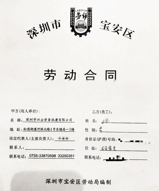 深圳市兴业劳务派遣有限公司与余超签订的劳动合同。