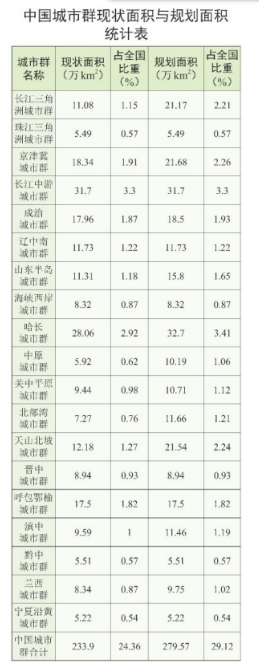 据《中国城市群地图集》统计,2016年,中国城市群现状面积为233.9万平方千米,占全国陆地总面积24.36%;到2030年的规划面积为279.57万平方千米,占全国陆地总面积将进一步增至29.12%。