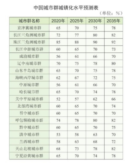 根据《中国城市群地图集》对各城市群规划目标及其发展现状和趋势研究形成的《中国城市群城镇化水平预测表》,到2035年,珠三角城镇化水平将达到90%以上,长三角、辽中南、呼包鄂榆、天山北坡等城市群城镇化水平将达80%以上。