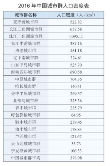 数据显示,2016年,中国城市群集聚的人口总量达10.39亿人、城镇人口5.71亿人,分别占全国总量的76.6%、72%;人口密度达378.98人/平方千米,是当年全国平均人口密度(144.1人/平方千米)的2.63倍。