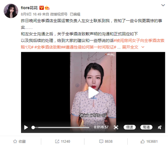 8月9日,花花再次在社交平台发声:自己已向全季酒店提出调取监控视频的要求,后续将对该男子正式提起诉讼。此外,花花称将向全季酒店索赔1元,希望全季和其母公司华住会,以及同类企业接受网友对同类事件的投诉监督,公示整改方案。