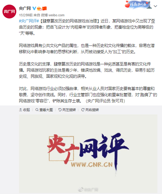#央广网评#【肆意篡改历史的网络游戏当治理】近日,某网络游戏中又出现了歪曲历史的现象:把岳飞设计为“肉袒牵羊”的投降者形象,把秦桧定位为高等级的“天”等等。