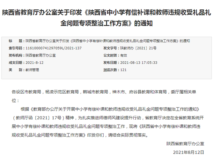 8月13日,陕西省教育厅官网上发布陕西省教育厅办公室关于印发《陕西省中小学有偿补课和教师违规收受礼品礼金问题专项整治工作方案》的通知,决定近期在全省教育系统开展中小学有偿补课和教师违规收受礼品礼金问题专项整治。对违纪人员调离教学岗位,撤销教师资格,直至清除出教师队伍。