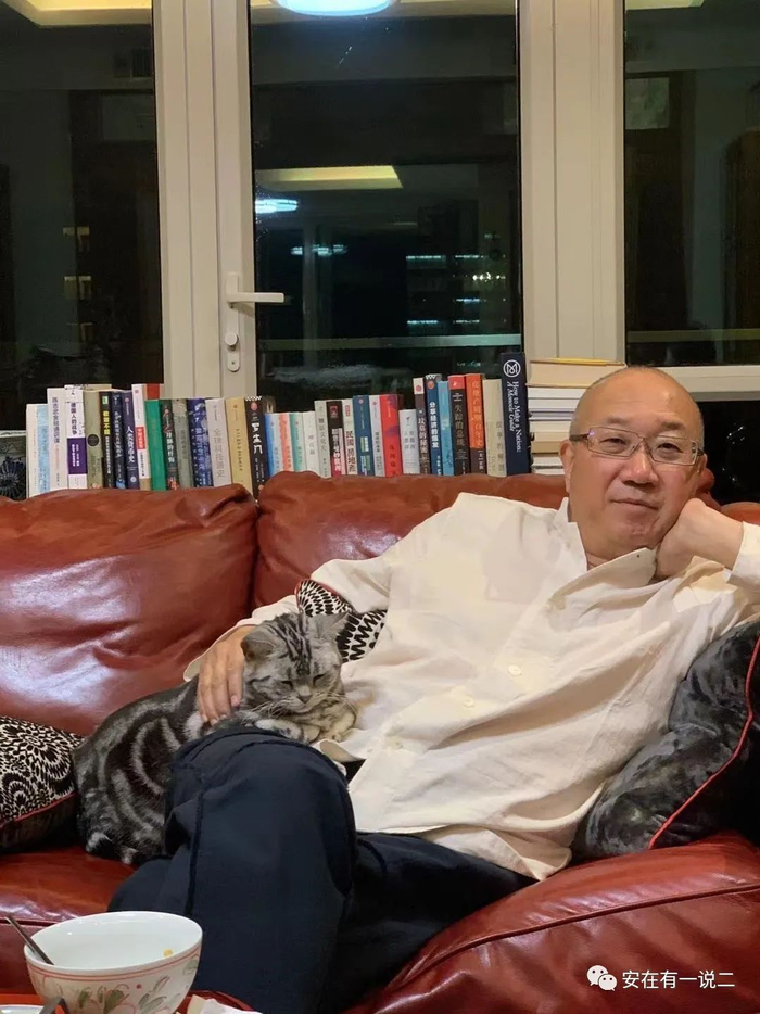 冯仑疫情期间在家中书房撸猫。