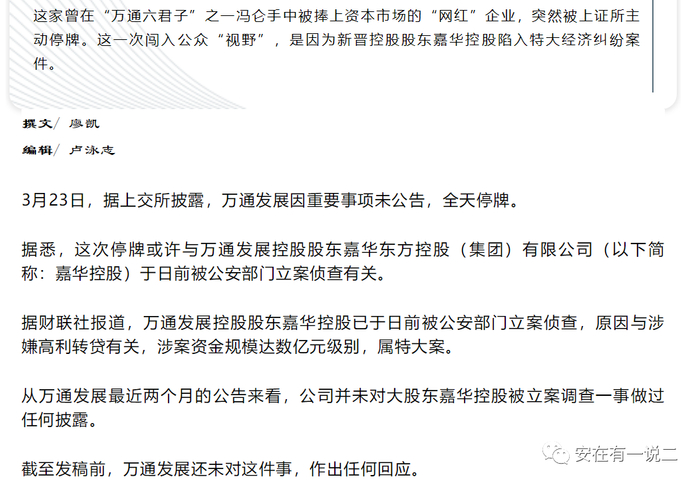 据悉,这次停牌或许与万通发展控股股东嘉华东方控股(集团)有限公司(以下简称:嘉华控股)于日前被公安部门立案侦查有关。”