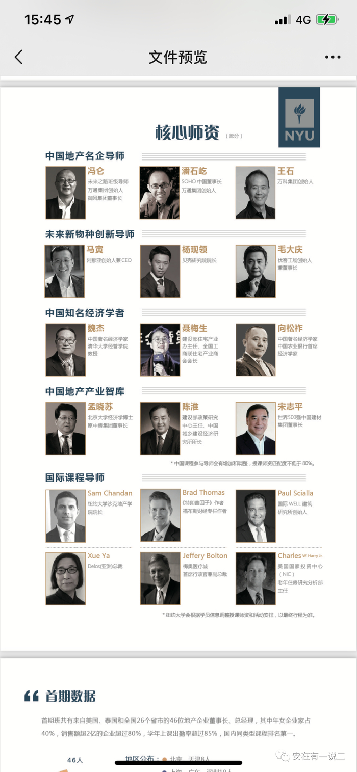 该“未来之路高端地产项目”由冯仑创立的“风马牛地产学院”联合“博雅俊学院”主办,部分学员参加了前述图说中的品器·不动产大会。课程部分导师,在地产界乃至财经圈很有名望,足见冯仑的资源能量。