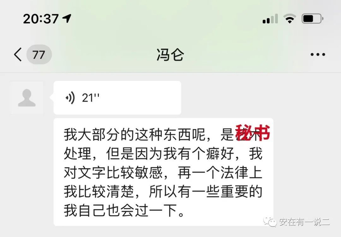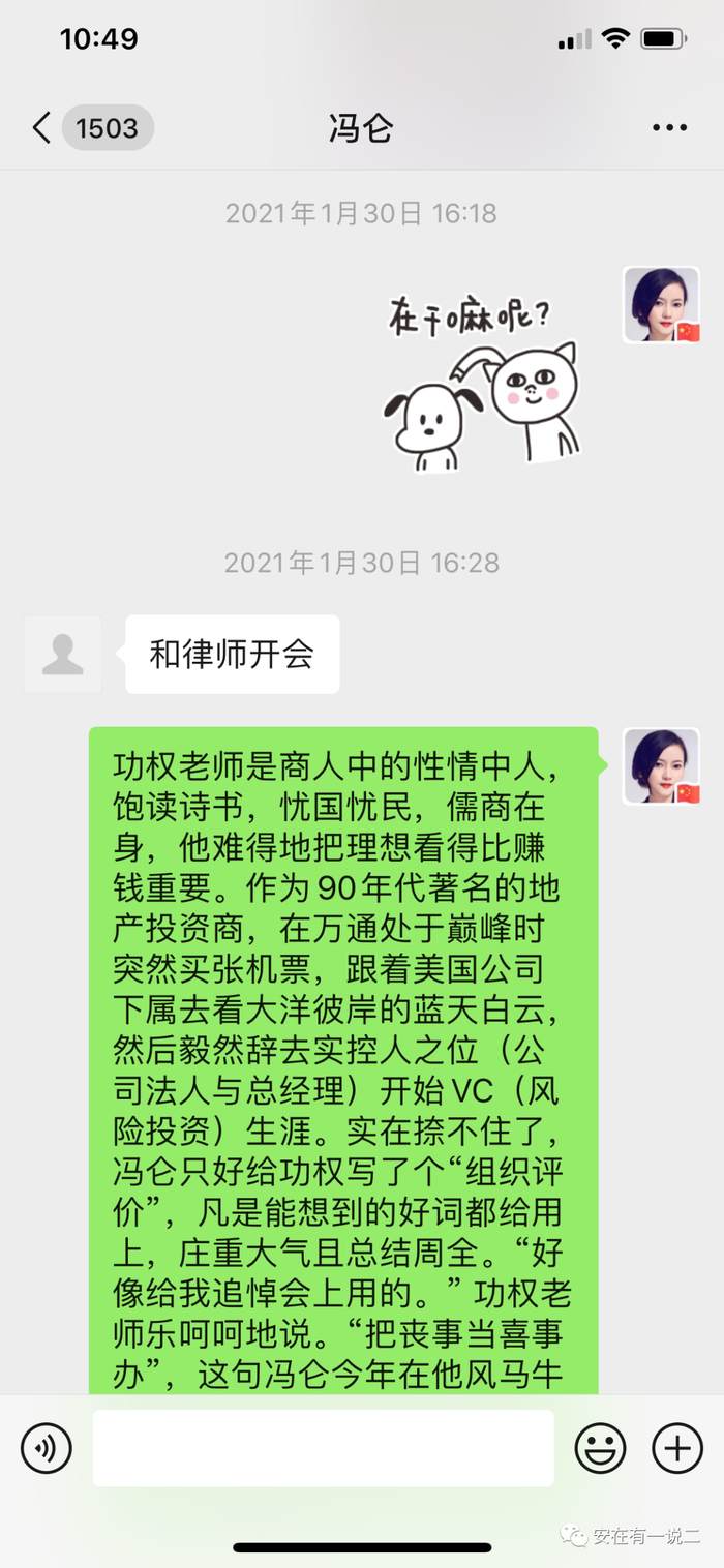 可以客观证明的是,在此新闻爆出的前一天中午,我尚与冯仑有过37分钟的通话,他状态正常语气平稳,一点儿没有受到所谓的“立案”影响。但在今年春节前后,与冯仑谈论相关媒体业务时,他曾多次提到过在与律师商议相关事务,例图如下,当时正与他核实一篇专栏人物稿。