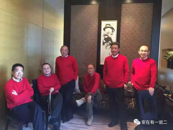 近几年,“万通六君子”的聚会合影。冯仑无论从图中气场还是实际作用上,均居于妥妥的C位。(左起:易小迪、刘军、王功权、冯仑、王启富、潘石屹,本文其他六人合影不再重复说明)