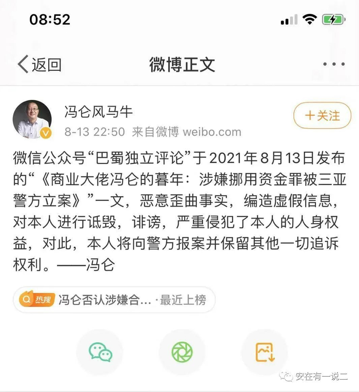 当天晚上22:50,冯仑发微博称,“微信公众号‘巴蜀独立评论’于2021年8月13日发布的《商业大佬冯仑的暮年:涉嫌挪用资金罪被三亚警方立案》一文,恶意歪曲事实,编造虚假信息,对本人进行诋毁,诽谤,严重侵犯了本人的人身权益,对此,本人将向警方报案并保留其他一切追诉权利”。