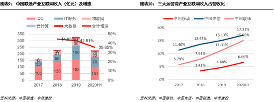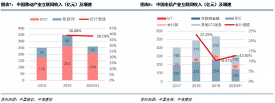 在传统业务增长乏力的背景下,三大运营商纷纷拓展产业互联网等新兴业务,包括IDC、ICT、大数据、物联网、云计算等,产业互联网业务收入及占收比均呈现提升趋势。2020年上半年,中国移动DICT与物联网业务合计实现收入260亿元,同比增长38%,占营收比为6.6%,较2019年同期提升1.8pct;中国电信产业互联网相关业务实现收入达到334亿元,同比增长13%,占营收比为17.2%,同比提升1.7pct;中国联通产业互联网业务实现收入227亿元,同比增长36%%,占营收比达15.1%,同比提升3.6pct。