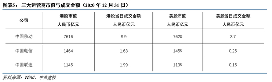 三大运营商在美股退市对其经营与融资并不构成实质影响。一是三大运营商的经营基本都在国内;二是其在美国发行ADR以来,并未进行过再融资;三是美国投资人对中国运营商并不青睐,以中国联通为例,虽市值基本相当,但2020年12月31日的美股成交金额为246万美元(0.16亿元),港股为2.36亿港元(1.99亿元)。