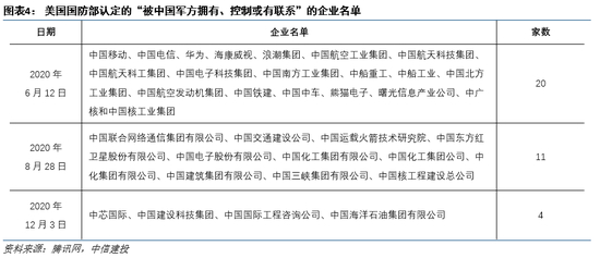 一是美国认定的“中国涉军企业名单”可能还会扩容,我们需要跟踪其它美国上市的中国公司。二是2020年12月18日,特朗普签署了一份名为“外国公司问责法案”的行政令,这项法令将会限制中国企业在美国上市。我们预计未来中国企业赴美上市数量可能大幅减少,港股与A股可能成优选。三是运营商美股被强制退市,可能只是中美博弈的一个缩影,中国自立自强仍将是未来的主旋律,投资上也值得关注。