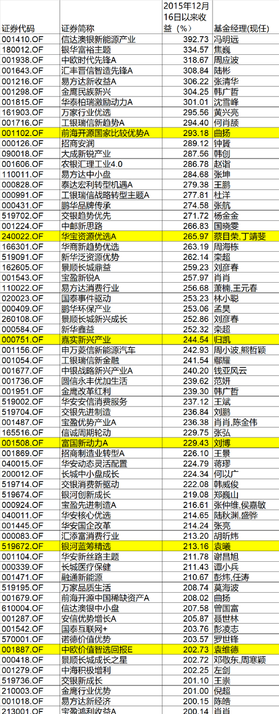WIND统计显示,从2015年12月16日以来接近年多时间里,主动权益类基金整体平均收益率为92.11%。翻倍基金数量同样可观,剔除基金C类,有504只主动权益基金业绩超200%。