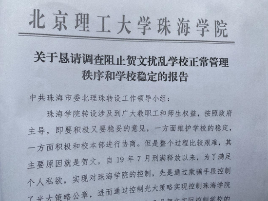 珠海学院部分人士说,贺文2019年11月起实际控制珠海学院,其控制权的不当获得、享有和行使,导致学校无可避免地出现治理僵局、管理失控。