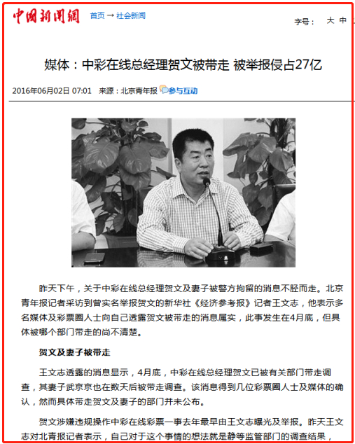 黑幕始作俑者、涉案关键人——中彩在线公司总经理贺文被查,其精心构筑多年的个人彩票“财富帝国”轰然坍塌。