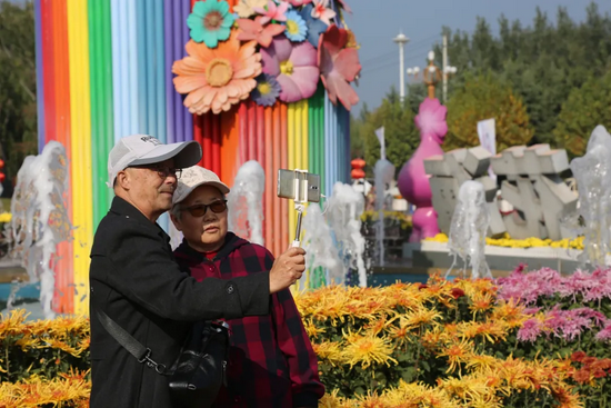 山东泰安,两名老人在花坛前自拍。/视觉中国