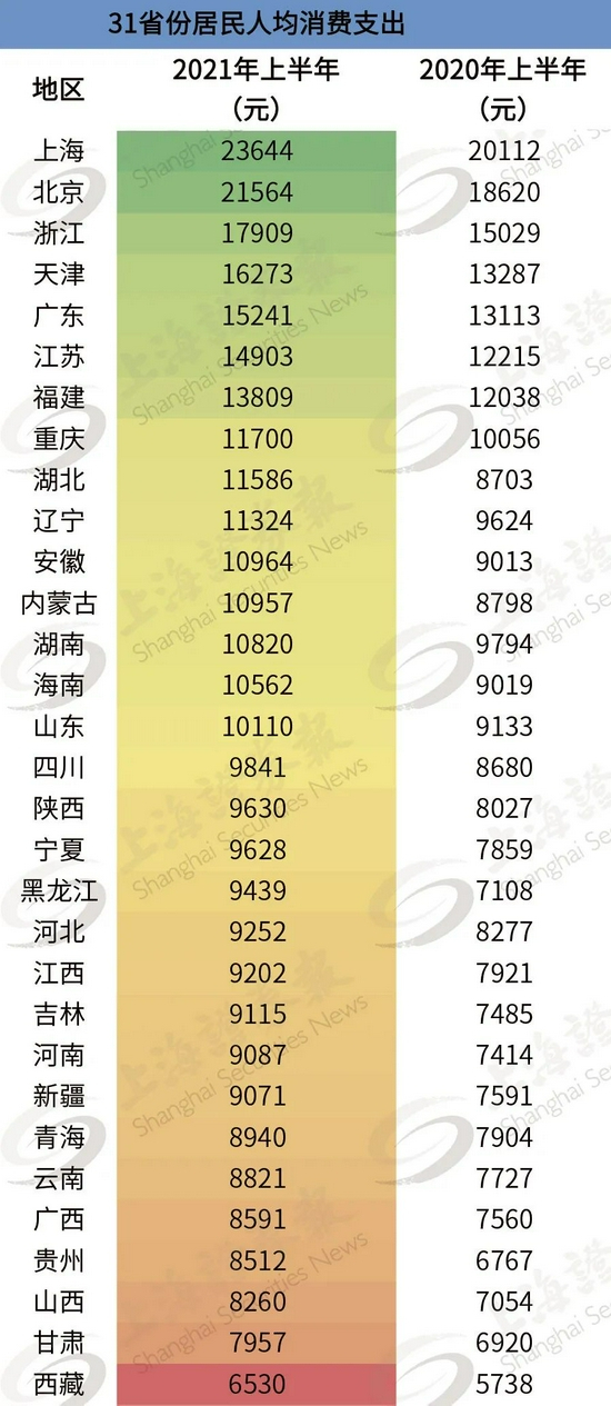 其中,京沪上半年居民人均消费支出均突破2万元。上海以23644元位居榜首,北京以21564元紧随其后。