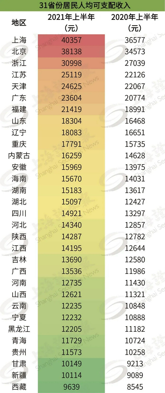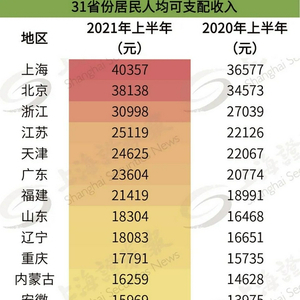 数据显示,上半年上海人均可支配收入首次突破4万元大关,以40357元继续占据全国第一的位置。北京以38138元居于次位,其他省份收入水平与两地有较大差距。