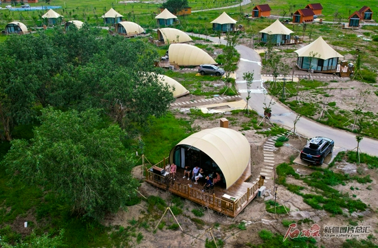 7月28日,游客在克拉玛依市乌尔禾国际房车露营公园里的贝壳房休闲。乌尔禾国际房车露营公园占地面积约800亩,是集景区、住宿、房车补给服务于一体的综合性露营度假场地。 □庞博摄