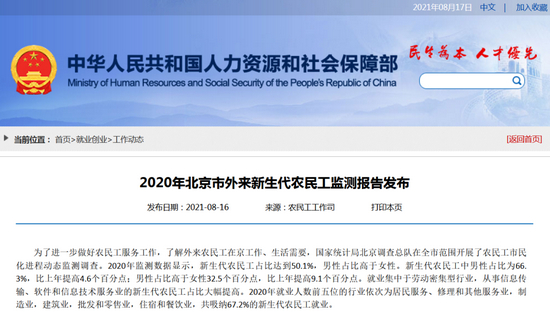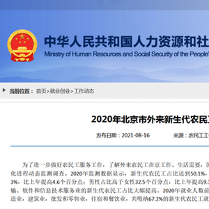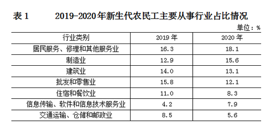 报告显示2020年就业人数排名前五行业是:居民服务、修理和其他服务,制造业,建筑业,批发和零售业,住宿和餐饮业,合计吸纳67.2%的新生代农民工。