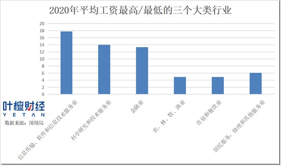 国统局数据显示,2020年平均工资最高的三个行业分别为信息传输、软件和信息技术服务业,科学研究和技术服务,金融业,工资分别为17.75万元、13.98万元和13.33万元。