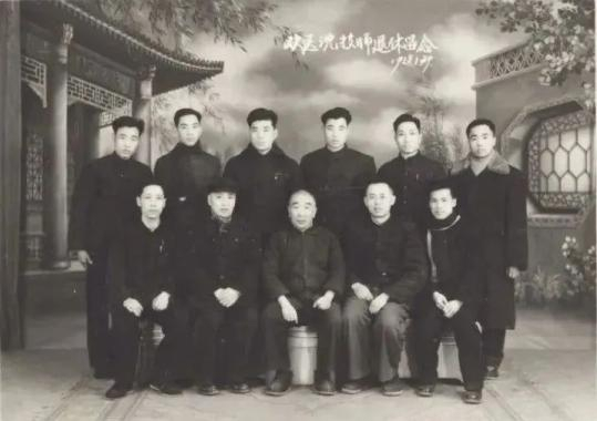 印钞机设计制造国有化的全班人马,欢送沈永斌光荣退休。一排左起:鲍振增、陈宏阁、沈永斌、于成群、朱焕明 二排左起:刘国栋、陈生文、李根绪、喻广华、关立桐、唐金铎