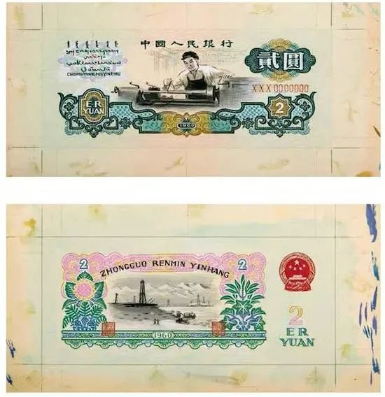 第三套人民币贰元券正背面画稿(周令钊绘制),22x14.5cm,1960年,中国印钞造币总公司藏
