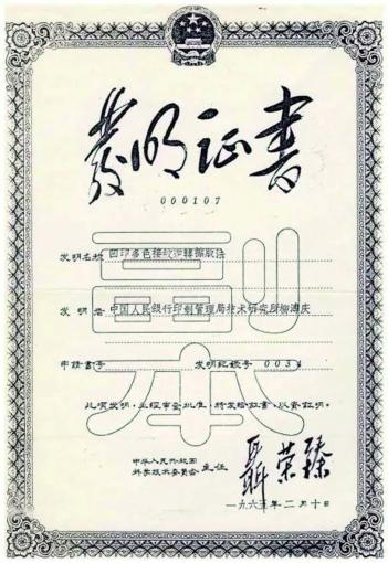 两部印钞机:凹印多色接纹循环擦版法和平凸印一版四色接纹印刷机,由中华人民共和国科学技术委员会颁给集体的发明证书