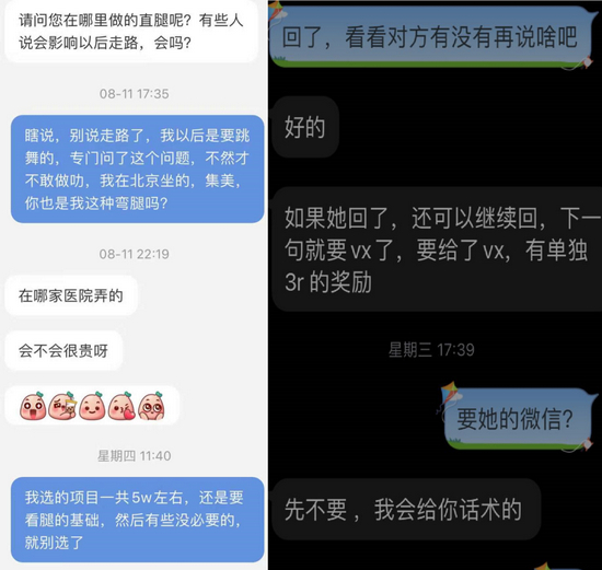 在微信交流时,《财经》记者表达了想瘦小腿的愿望,对方“诚恳”回应无法提供帮助,直言直腿术不能瘦小腿,想瘦小腿得找其它合适的项目,如瘦腿针、小腿吸脂等。经过要求,对方推介了一名“博主”,声称在其牵线之下可以找到合适的医生操作直腿术。在《财经》记者表达了对手术痛感和后遗症的担忧后,对方一再强调:“打麻药睡了就好了,没啥感觉”“什么都怕,什么都改变不了,根本不用担心”。