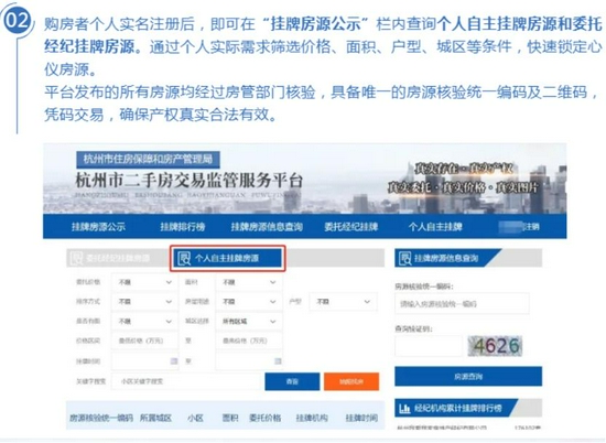 如果你想买房,进入“杭州市二手房交易监管服务平台”后,也进行个人实名注册,就可以在“挂牌房源公示”栏内查询个人自主挂牌房源和委托经纪挂牌房源
