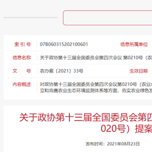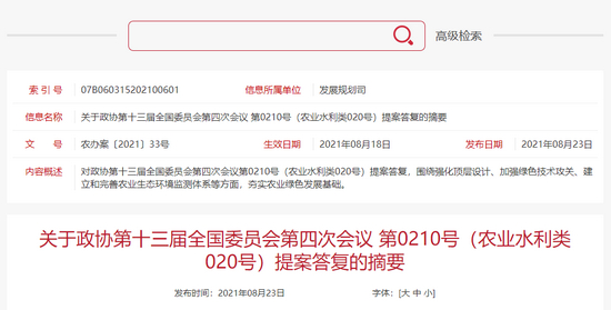 原标题:关于政协第十三届全国委员会第四次会议 第0210号(农业水利类020号)提案答复的摘要