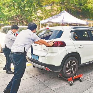 使用期间需要4名保安配合,每人负责一个车轮。从移车器的置入到成功挪车,全程只用了短短几分钟。