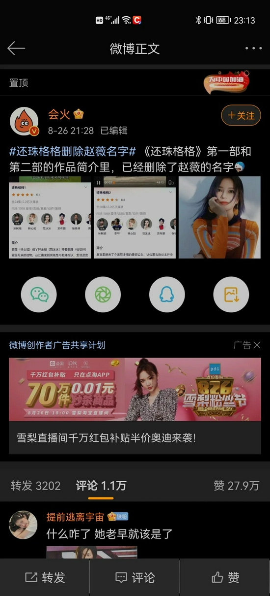 8月26日晚间,突然有网友在社交平台上发文称,《还珠格格》第一部和第二部删除了主演赵薇的名字。