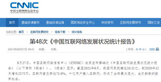 8月27日,中国互联网络信息中心(CNNIC)在京发布第48次《中国互联网络发展状况统计报告》(以下简称《报告》)。《报告》显示,截至2021年6月,我国网民规模达10.11亿,较2020年12月增长2175万,互联网普及率达71.6%。十亿用户接入互联网,形成了全球最为庞大、生机勃勃的数字社会。