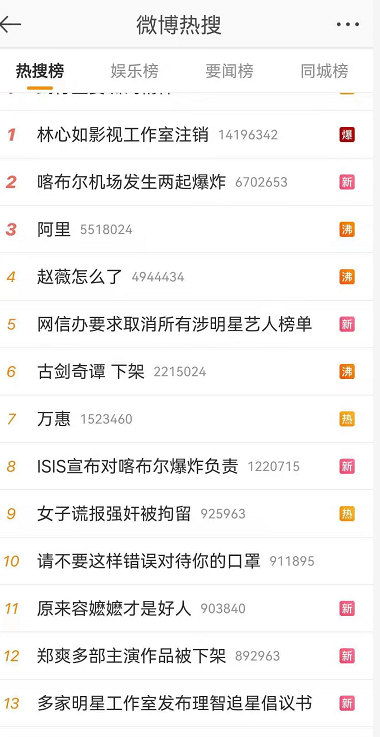 原标题:娱乐圈地震!赵薇、郑爽主演作品被“除名”、下架,微博超话关闭!中央网信办:取消明星艺人榜单,严管明星经纪公司