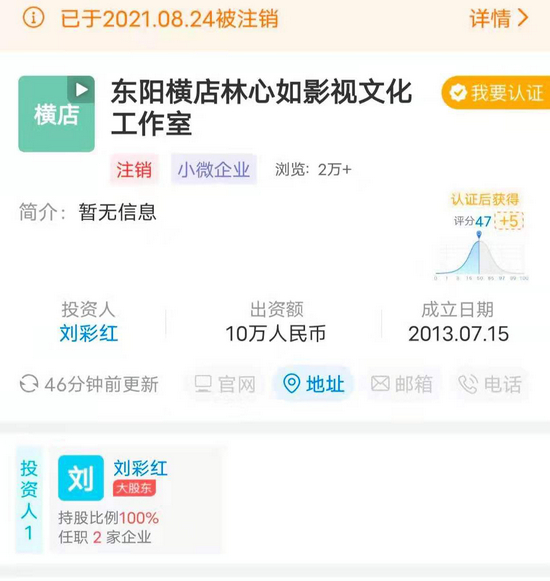 此外,《还珠格格》另一位女星林心如旗下工作室刚刚注销。天眼查显示,近日,东阳横店林心如影视文化工作室发生工商变更,企业状态由存续变更为注销,注销原因为决议解散。去年林心如的丈夫霍建华工作室也已注销。