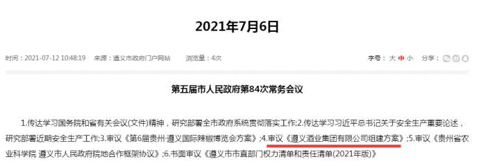 遵义市政府官网上的公开信息显示,在7月6日召开的遵义市人民政府第84次常务会议上,其中的一项重要议题便是审议《遵义酒业集团有限公司组建方案》。