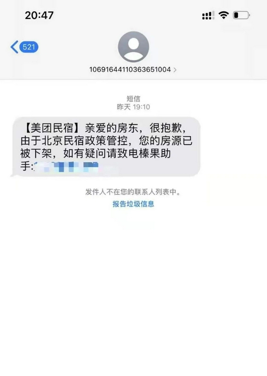 在环球影城旁边做民宿的阿杰在一周前陆续收到平台的下架通知。最早通知的是爱彼迎,随后,美团、大众点评也都通过短信或App系统消息进行了通知。通知中提到阿杰尚未提交房源经营资质,将于8月27日正式下架房源。