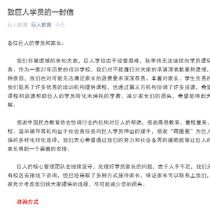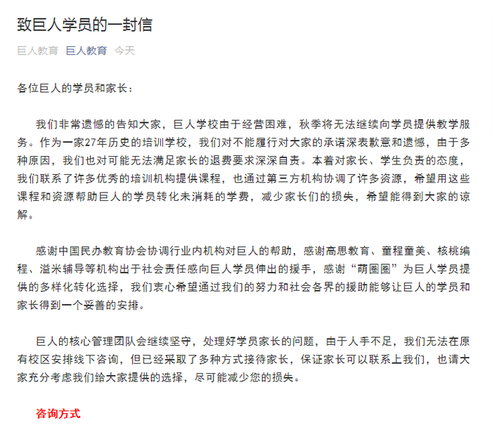 巨人的核心管理团队会继续坚守,处理好学员家长的问题,由于人手不足,我们无法在原有校区安排线下咨询,但已经采取了多种方式接待家长,保证家长可以联系上我们,也请大家充分考虑我们给大家提供的选择,尽可能减少您的损失。