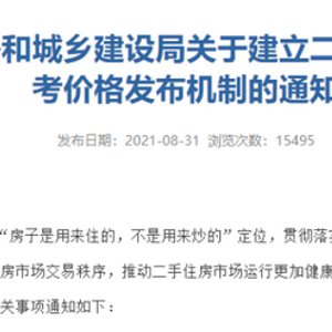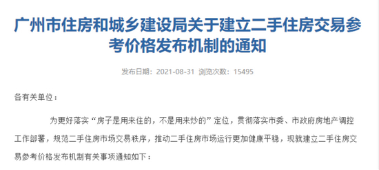 8月31日晚,广州市住房和城乡建设局发布《关于建立二手住房交易参考价格发布机制的通知》(简称《通知》)。明确指出,在成交活跃区,以住宅小区为单位,在过去一年二手住房网签成交价格基础上,综合考虑评估价格、周边一手楼盘成交价格等因素,形成二手住房交易参考价格,并视市场运行情况在住建局官方网站、微信公众号等适时发布。