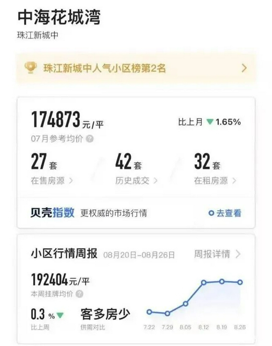 根据房产中介提供的“小区行情周报”,显示中海花城湾小区的本周挂牌均价192404元/平方米,7月的参考均价为174873元/平方米。