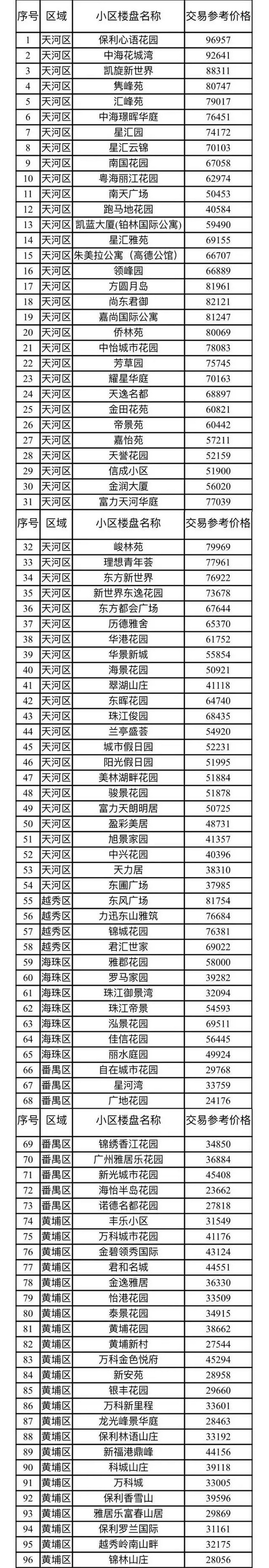《首批热点区域住宅小区二手住房交易参考价格表》涉及天河、越秀、海珠、番禺、黄埔五个热门区域,96个小区,其中天河区54个。天河区的保利心语花园,中海花城等热点高端楼盘都在该名单上。