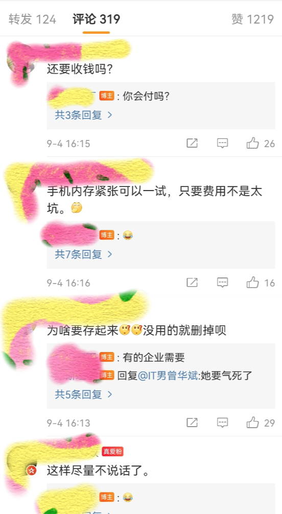 评论区异常火爆,网友的评论集中在三个方面,一部分网友认为这个功能“大可不必”,手机云空间也可以做到,一部分网友对苹果和安卓收费不一样表示费解,不过仍有一小部分网友认为“这是好事,方便工作”。