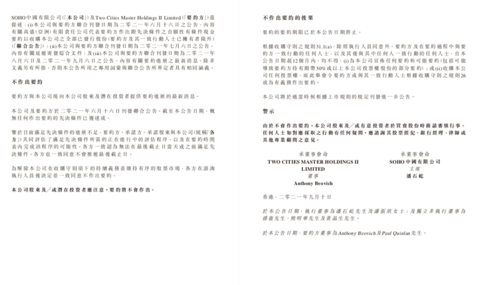 公告还称,要约方及SOHO中国仍可能被要求提供进一步信息及材料供监管机构审查。于本公告日期,概无任何先决条件已获达成。