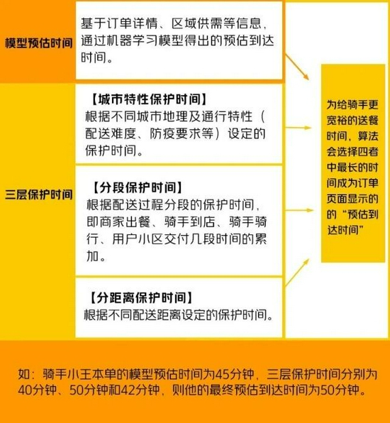 系统根据上述四种算法分别计算出模型预估时间、城市特性保护时间、分段保护时间与分距离保护时间,并选取四者中最长的时间作为预估送达时间,以便为外卖员留出更充裕的送餐时间。由于考虑到城市通行等因素,即便是相同路线的订单,每天给骑手和用户参考的配送时段也会有所差异。